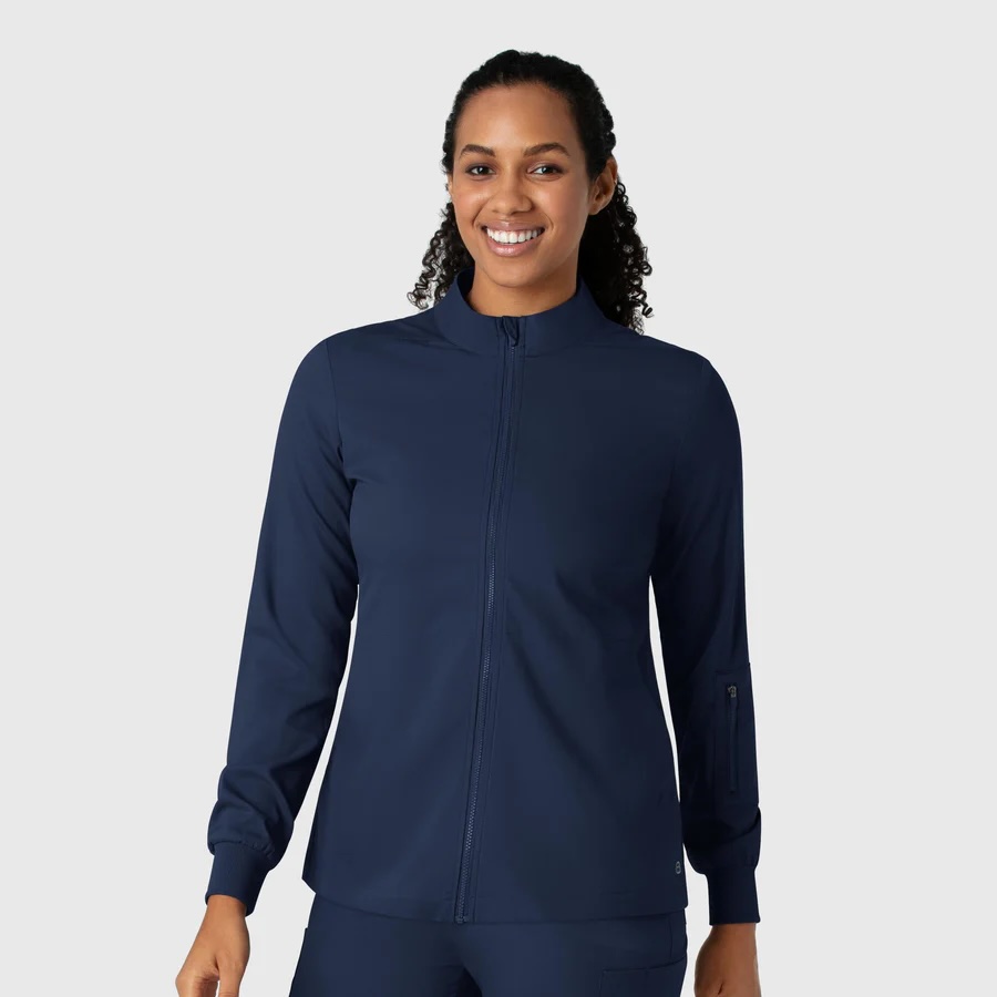Stay comfortable even in chilly offices and air-conditioned patient rooms with this women’s essential warm-up jacket. It’s the perfect piece to layer over your scrubs to keep you warm so you can stay focused. Along with offering all the comfort you need, it gives you an extra place to store tools and supplies while you’re on the go. Two front pockets let you warm your hands or keep essentials handy, while one sleeve card pocket with a zipper secures smaller items. A generous pocket on the inside is designed to hold your tablet, providing hands-free mobility as you move between rooms and down corridors. The full-zip front gives you options when temperatures fluctuate, letting you easily transition from more warmth to less. Ribbed cuffs at the wrist add a cozy touch that keeps your hands free to move without material getting in the way. Built from soft, stretchy fabric, this warmup jacket gets you through long shifts with comfort that’s like a hug.